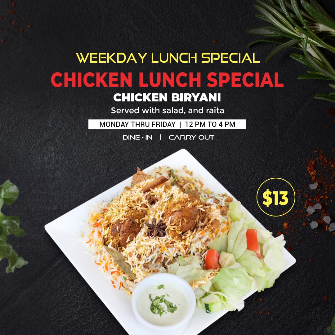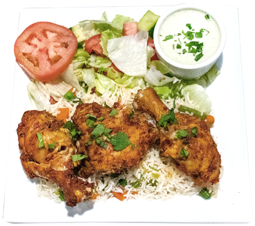 Tandoori Bihari Chicken $133 pcs of bihari chicken served with veg basmati rice, salad and raita