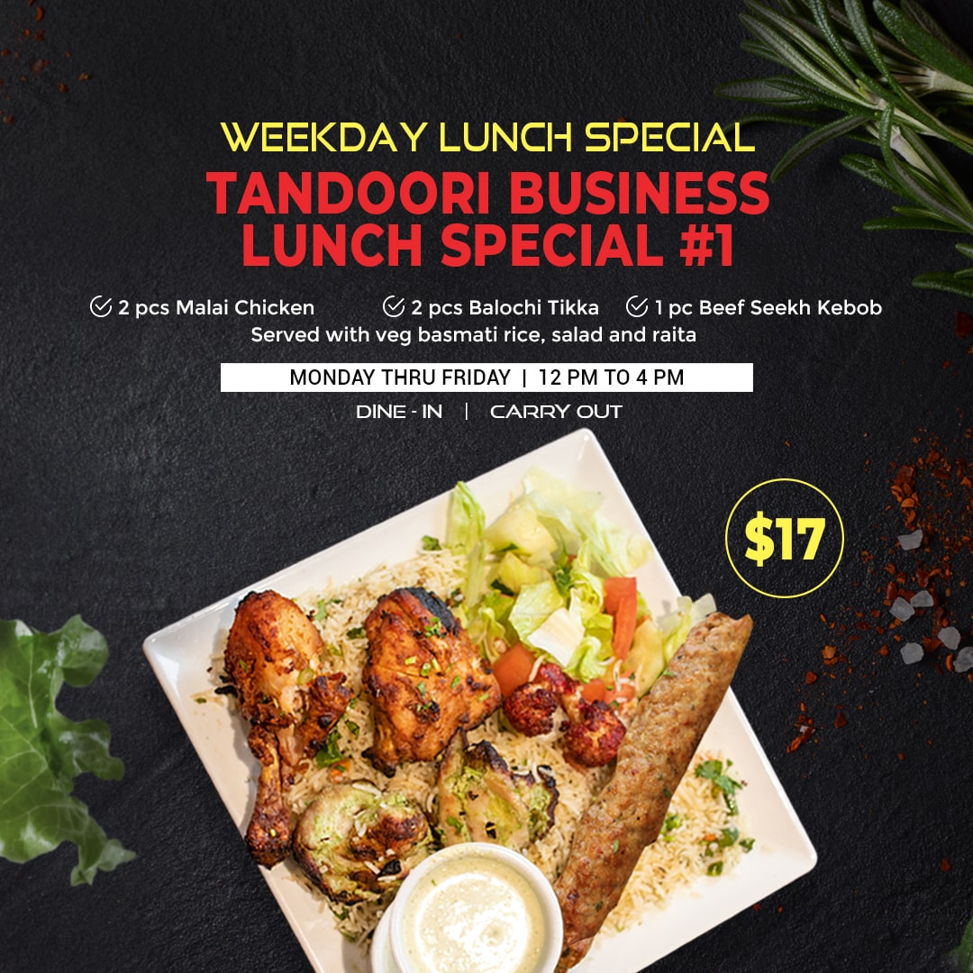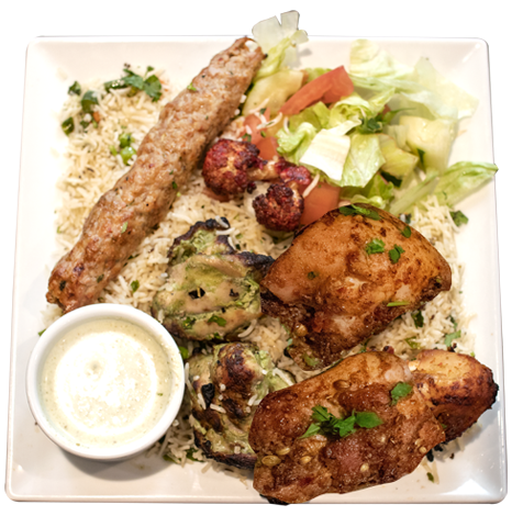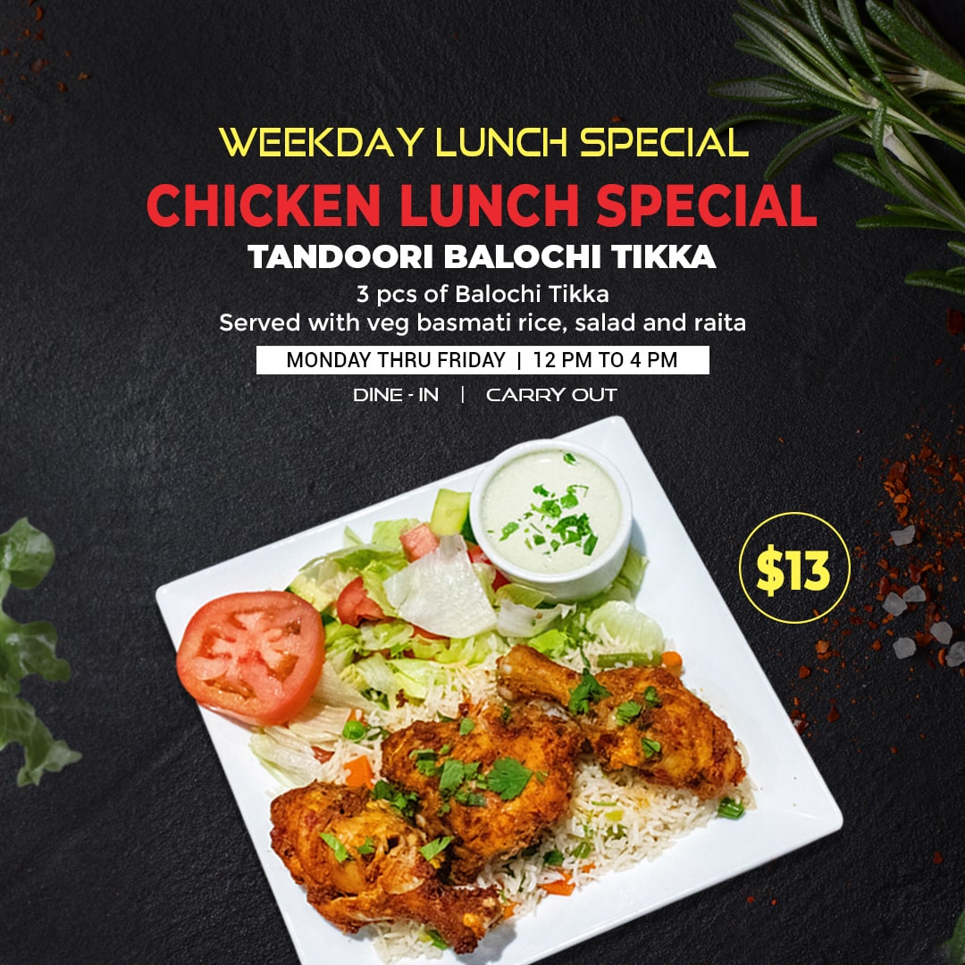 Tandoori Balochi Tikka $133 pcs of balochi tikka served with veg basmati rice, salad and raita