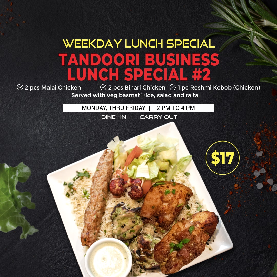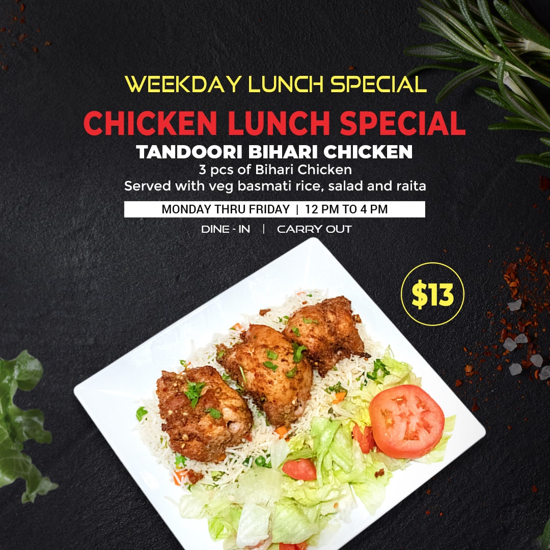 Tandoori Bihari Chicken $133 Pcs Of Bihari Chicken Served With Veg Basmati Rice, Salad And Raita