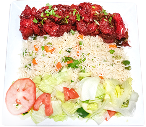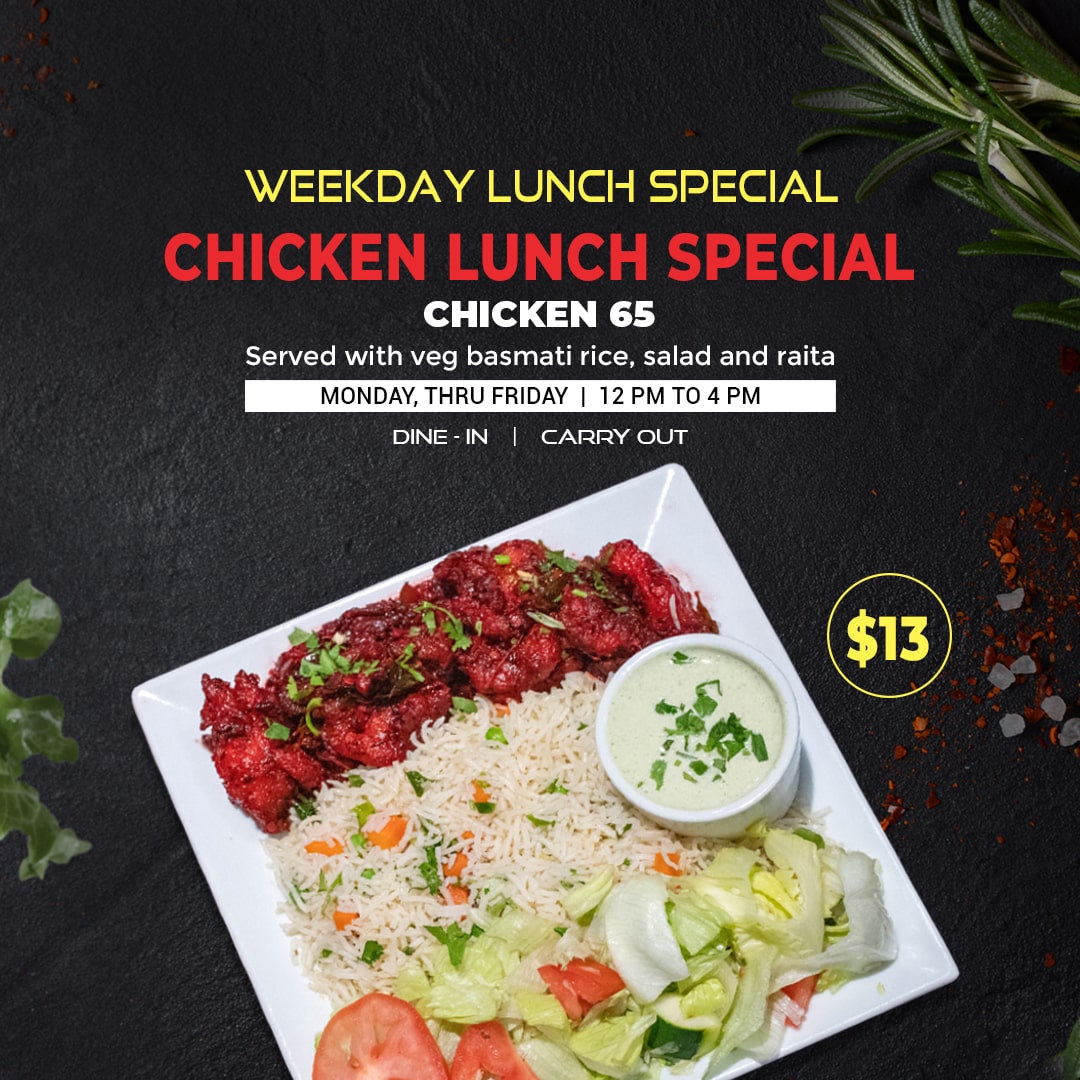 Chicken 65 $13Served with veg basmati rice, raita and salad
