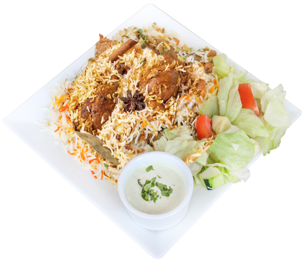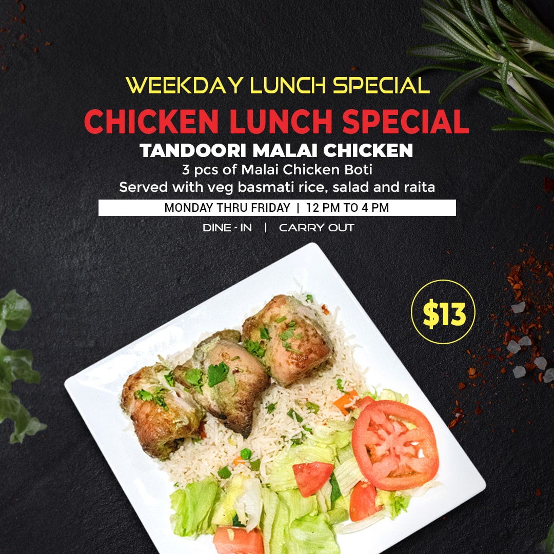Tandoori Malai Chicken $133 pcs of malai chicken boti served with veg basmati rice, salad and raita
