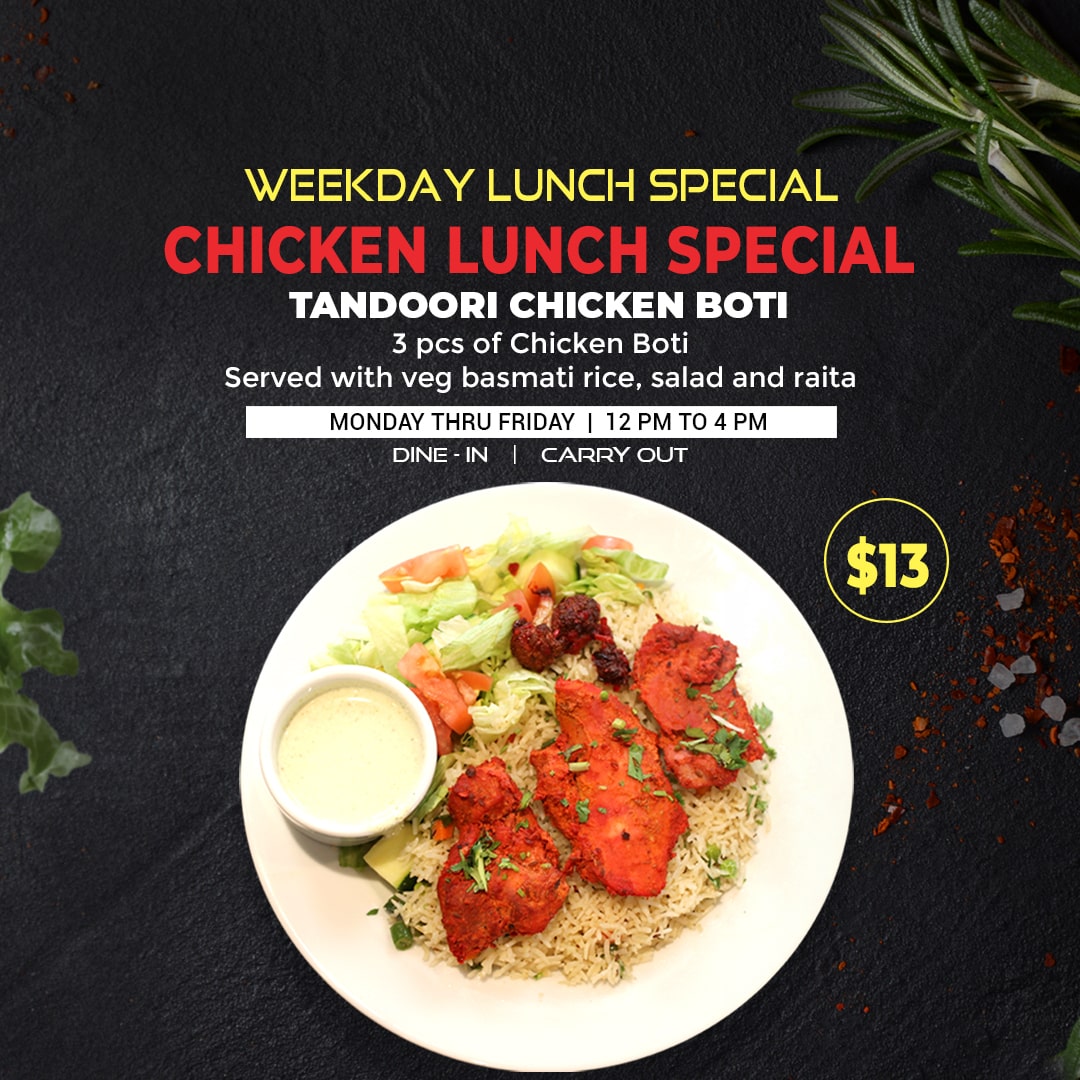 Tandoori Chicken Boti $133 pcs of chicken boti served with veg basmati rice, salad and raita