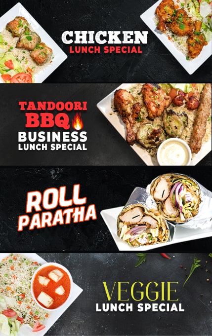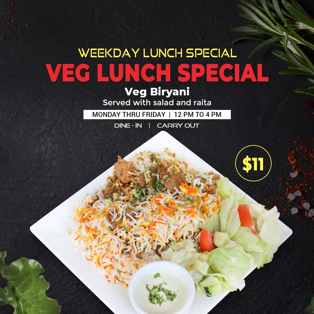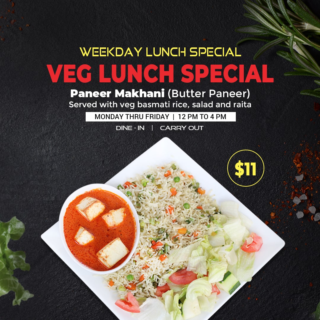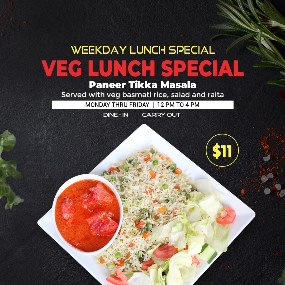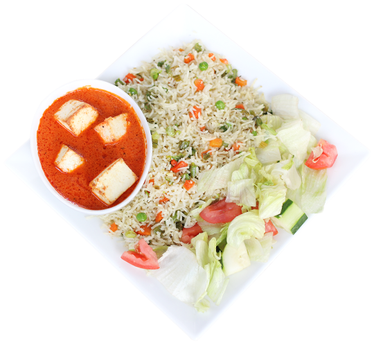 Paneer Tikka Masala $11Served with veg basmati rice, salad and raita