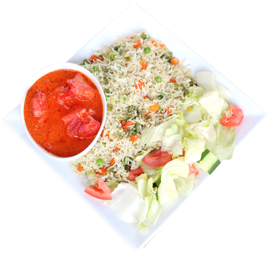 Butter Chicken $13Served with veg basmati rice, salad and raita